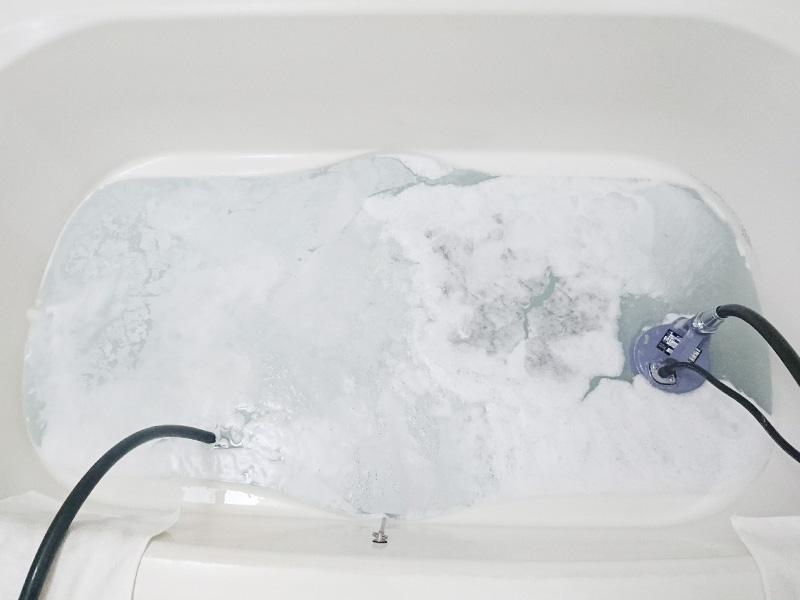 市販の洗浄剤や風呂釜洗浄機などでは落ちない汚れも、スッキリきれいになります。入浴剤の成分が付着していても効能に左右されません。